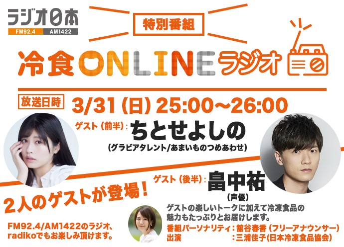 ラジオ日本(3月31日)で、ちとせよしの(グラビアタレント・あまいものつめあわせ)さんと畠中祐さん(声優)をゲストとして迎えた特別番組を放送いたします。