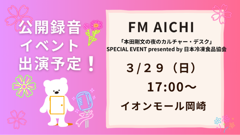 イベント名 公開録音イベント『FM AICHI「本田剛文の夜のカルチャー・デスク」SPECIAL EVENT presented by 日本冷凍食品協会』
