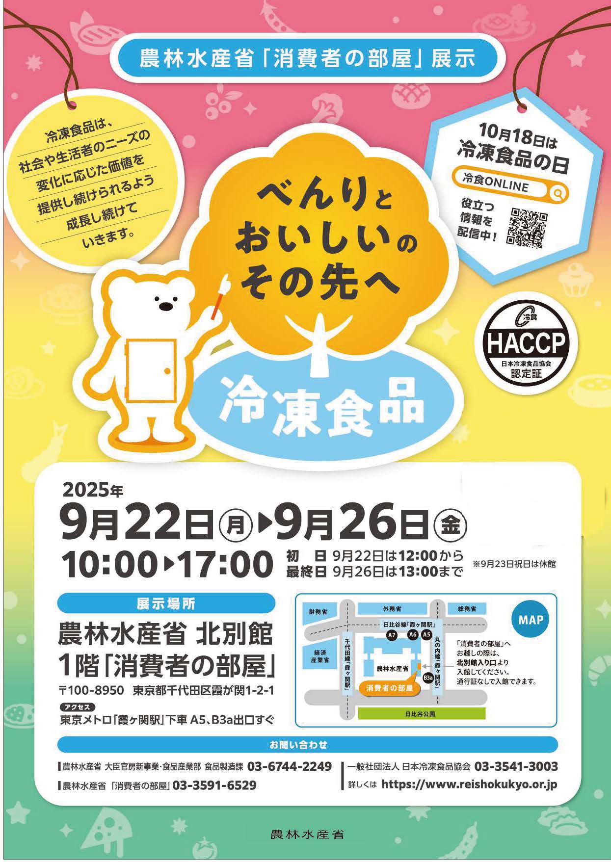 2025年9月22日(月)~9月26日に農林水産省「消費者の部屋」にて展示を行います。 「べんりとおいしいのその先へ 冷凍食品」をテーマとして、パネル・ダミーパッケージ等を展示して、冷凍食品の優れた特性をわかりやすく紹介します。どなたでもご入場いただけますので、ぜひお越しください。